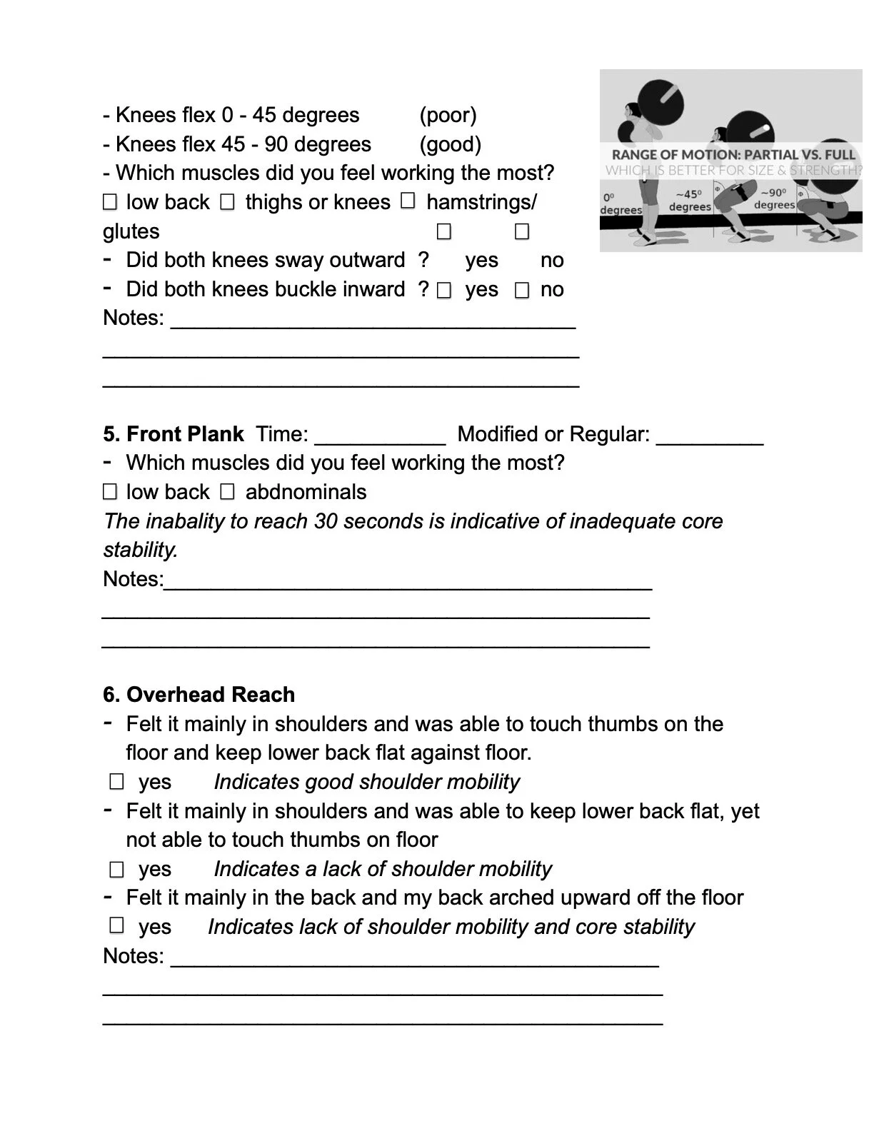 Use the assessment tracking form to track determine core strength, balance, shoulder flexibility and foot strength. Perform the exercises that you scored low on daily or every other day. Print the forms below to monitor your progress and journal your corrective exercise routine.